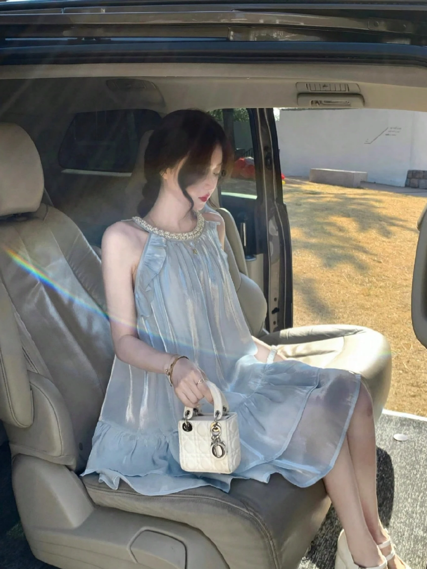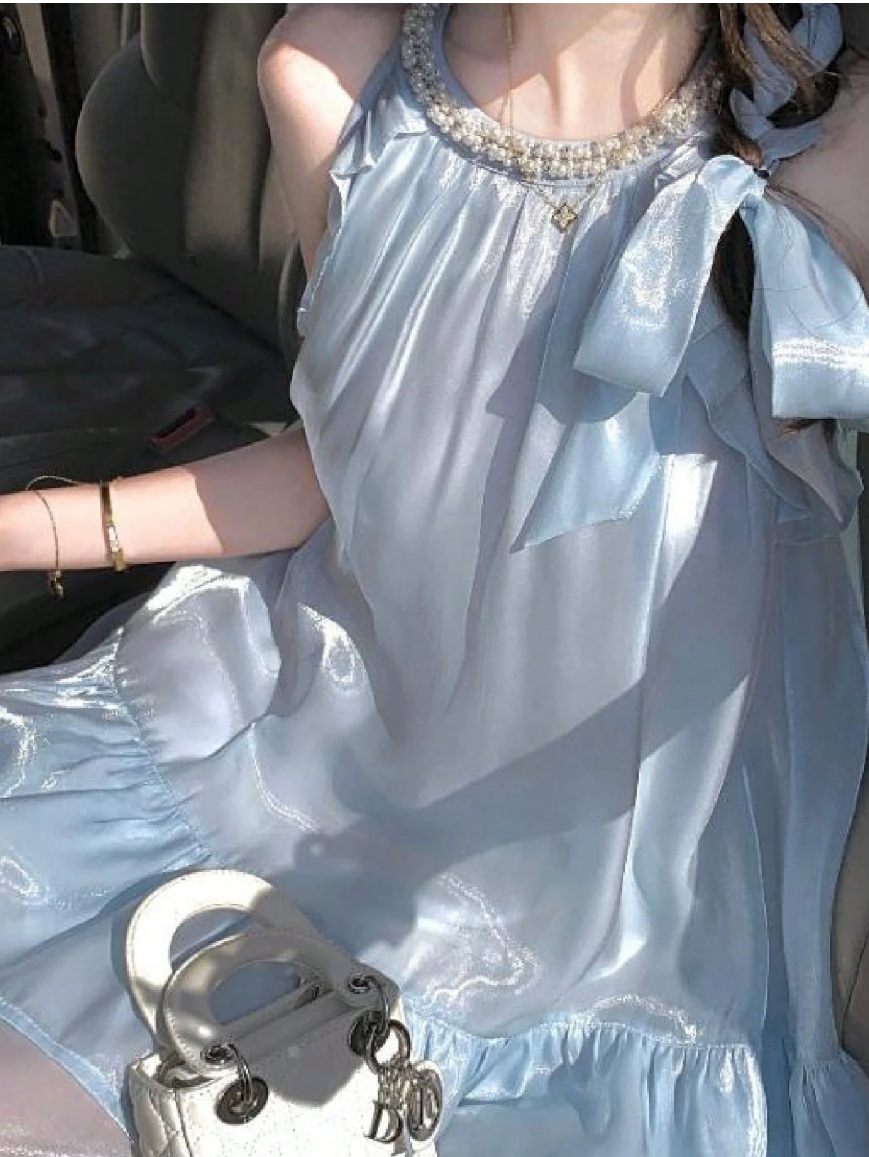 午後の陽ざしがやさしく差し込むティーサロン。そんな穏やかな時間を纏うような、ライトブルーのサテンワンピース。肩に添えられたリボンと、繊細に輝くビジューのネックラインが、甘さの中に気品を添えます。ふんわりと広がるギャザースカートは、座っていても美しいラインを保ち、優雅なひとときを演出。