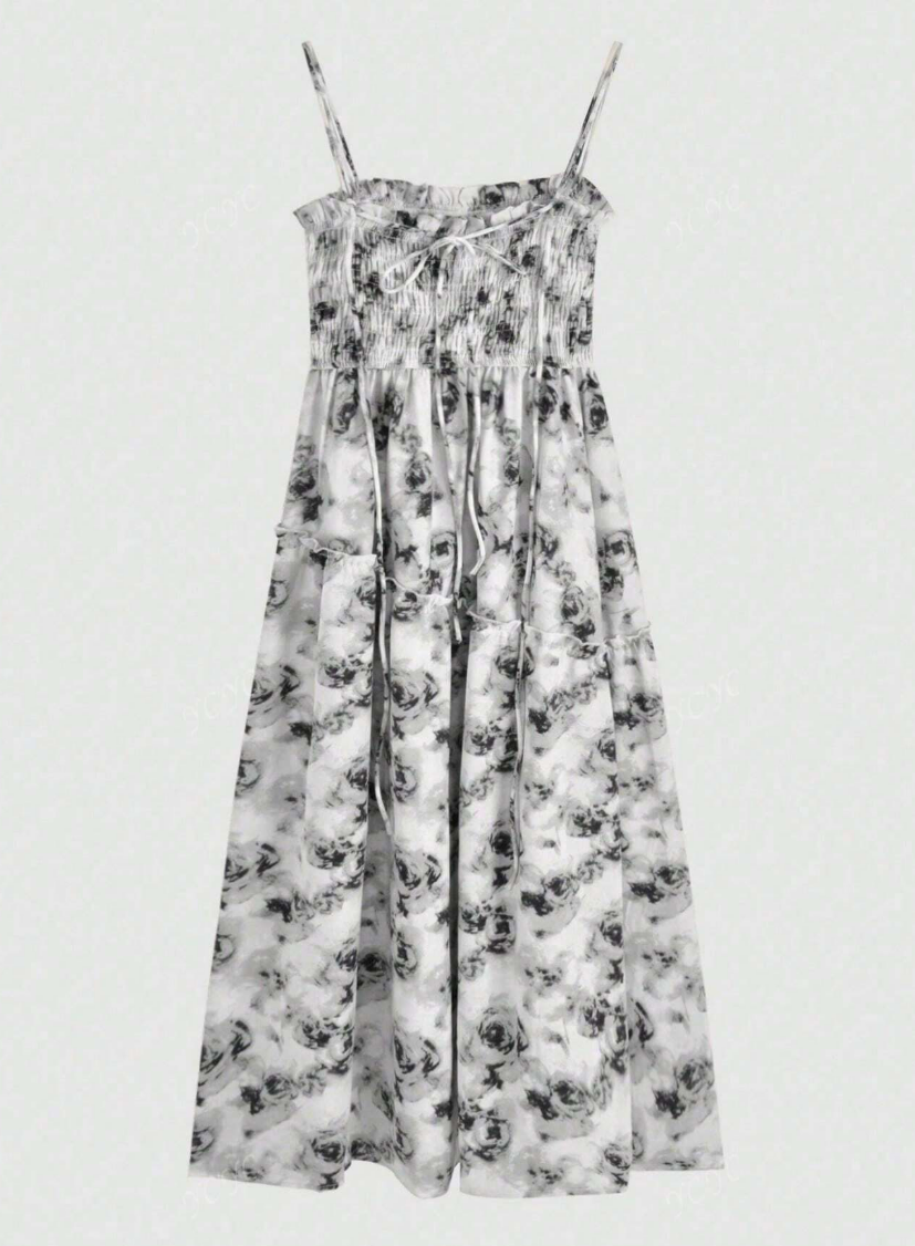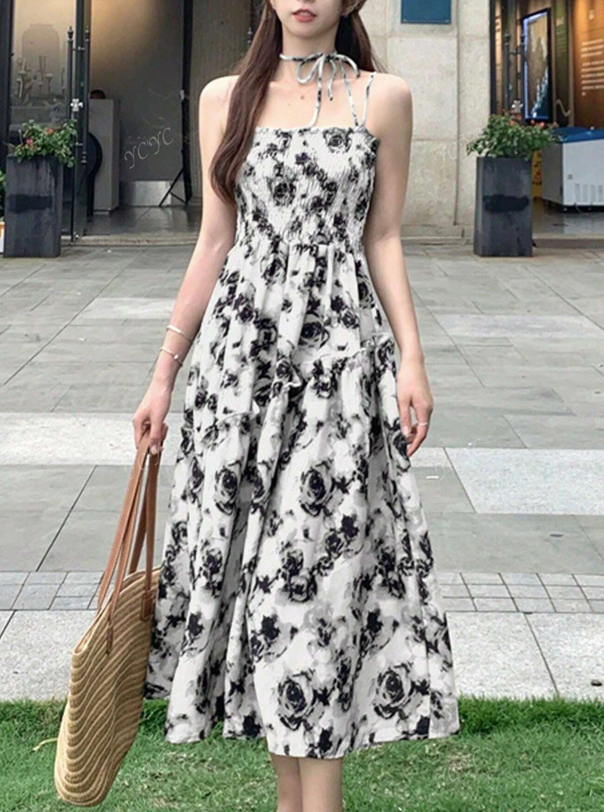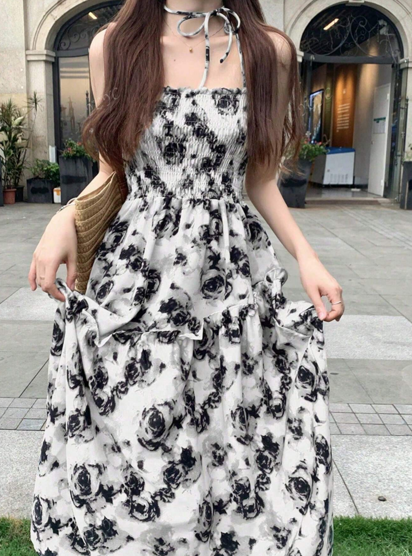 誰にも知られていない庭園に、そっと咲く一輪の花。そんな静かな美しさを纏う、モノトーンフラワーのロングワンピース。肩のリボンストラップが繊細な余韻を残し、スモッキング加工の身頃が優しく身体に寄り添います。風に揺れる軽やかな素材が、歩くたびに物語を紡ぐような一着。