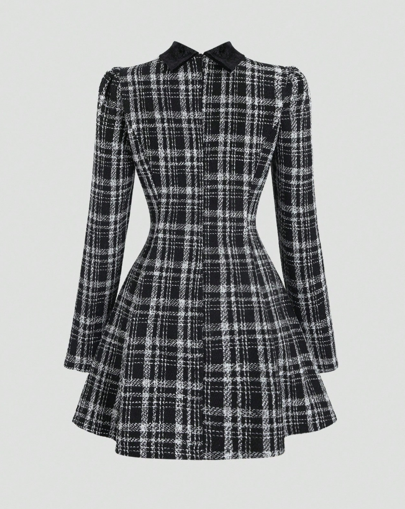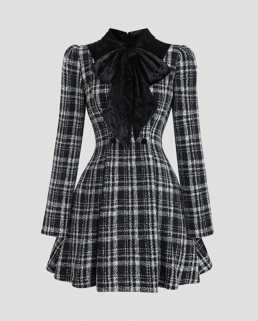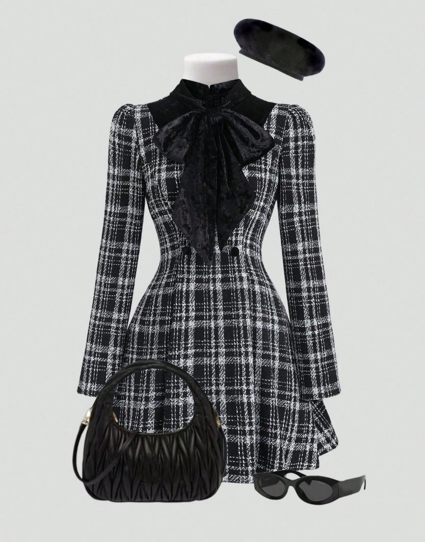 モノトーンのチェック柄に、ベルベットのリボンがそっと寄り添う。 「ノワール・ミューズ ワンピース」は、凛としたシルエットと繊細なディテールで、静かな存在感を放つ一着。 ウエストラインを美しく引き立てる構築的なフォルムは、歩くたびにスカートがやわらかく揺れ、まるで物語の中のヒロインのよう。クラシカルな襟元と長袖のバランスが、秋冬の装いに上品さを添えます。